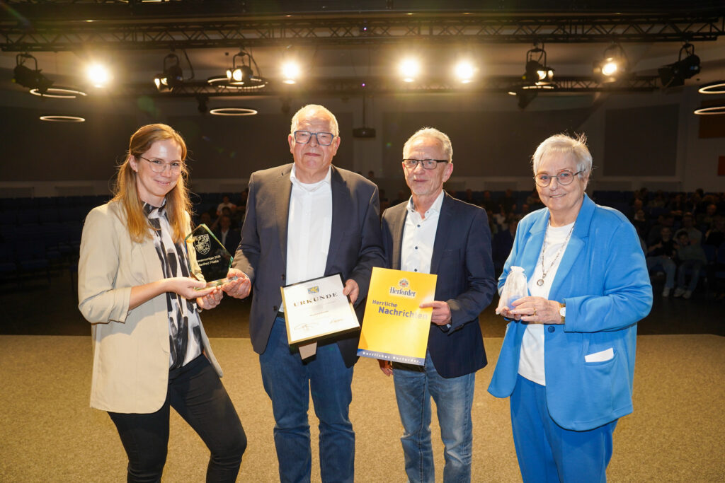 Herzlichen Glückwunsch! Aus den Händen von Catharina Lappe (Gemeindesportverband Hiddenhausen), Peter Lohmeyer (Herforder Brauerei) und Monika Schwannecke (stellv. Bürgermeisterin der Gemeinde Hiddenhausen) erhält „unser“ Manfred den Ehrenamtspreis der Gemeinde Hiddenhausen.